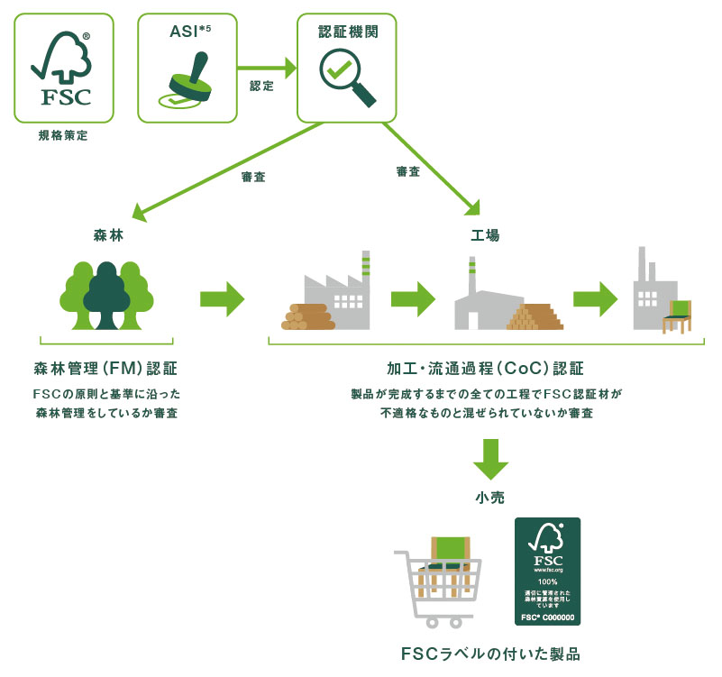 Custody)認証の連鎖から成り立っています。FSC認証製品が消費者の手に届くまでには、最終製品になるまでの生産、加工、流通に関わるすべての組織が認証を受けなくてはなりません。また、FSC認証の審査・発行は、FSCではなくASIから認定を受けた独立した第三者の認証機関が行います。