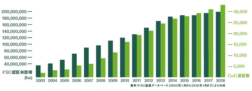 世界のFSC認証林面積とCoC認証件数