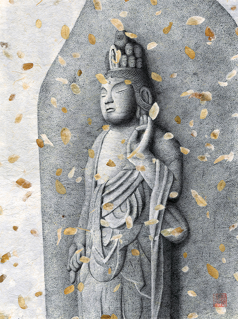 ピエゾグラフとは、写真や絵画、版画といったアートをもとに、筆のタッチや素材感など、作品のあらゆる"質感"を再現するデジタルプリント技法です。スキャニングによって粒子にまで分解された作品データが、使用する用紙(メディア)に最適化され、インクジェットプリンタによって、質感の伴った画像として再構成・出力されます。